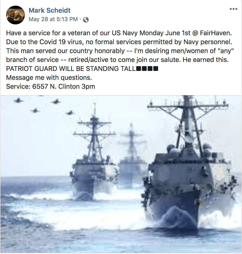 When Scheidt began to make the arrangements for Thompson and learned that the Navy would not be supply an Honor Guard for the service due to Covid, he turned to social media and his own network of family and friends with this post: